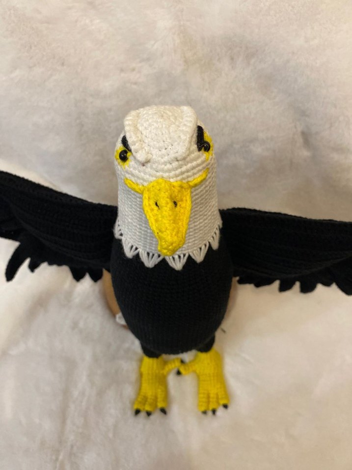 Bu peluş oyuncak, parlak sarı gagası ve ayakları ile renkli detaylara sahip gri bir kartal figürüdür. Yumuşak dokuludur ve dekorasyon veya oyun için uygundur.