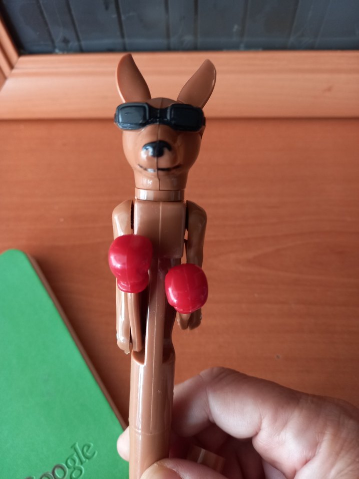 Kahverengi plastikten yapılmış, güneş gözlüğü ve kırmızı boks eldivenleri olan renkli kanguru aksiyon figürü. ayni zamanda kalem