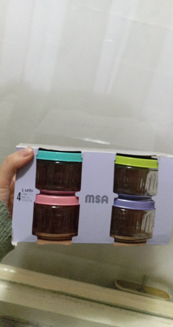 Pastel renklerde mavi, yeşil, pembe ve mor kapaklı 4 adet cam saklama kabı seti. Kompakt boyutlarda, farklı yiyecekler için uygun.