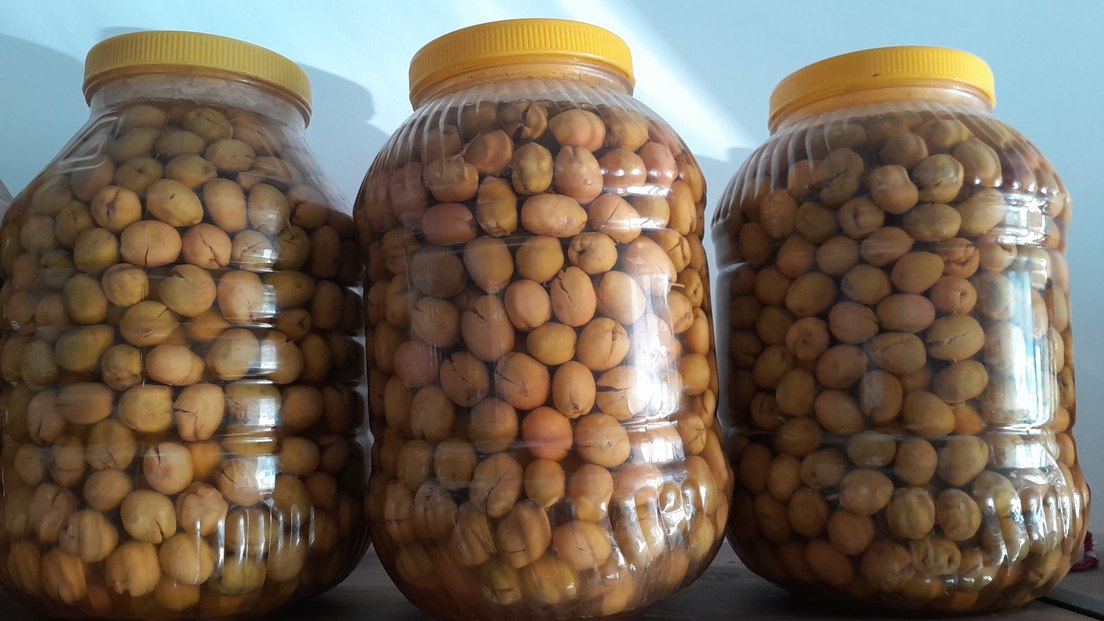 Renkli sarı kapaklı, içi dolu bej renkte büyük şeffaf gıda kabı. Saklama için uygundur.