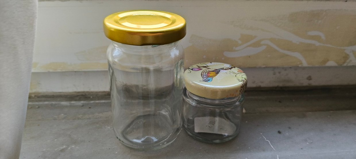 Altın ve kuş desenli renkli bej kapaklı iki cam saklama kavanozu. Altın 4 tane kuş desenli 4 tane bej kapaklı 3 tane toplam 11 kavanoz