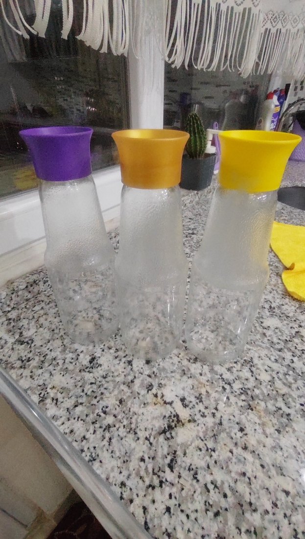 Mor, turuncu ve sarı renkli kapaklara sahip dokulu camdan yapılmış üçlü vazo seti. Çiçek sergilemek için uygun. Adet fiyatı 75 tl