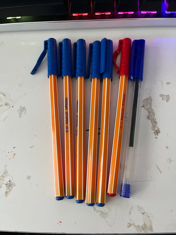 Mavi ve kırmızı kapaklı, turuncu çizgili gövdeli çoklu tükenmez kalem seti. Rahat tutuş ve akıcı yazım sağlar. ✏️ çoğu hic kullanılmamıştır