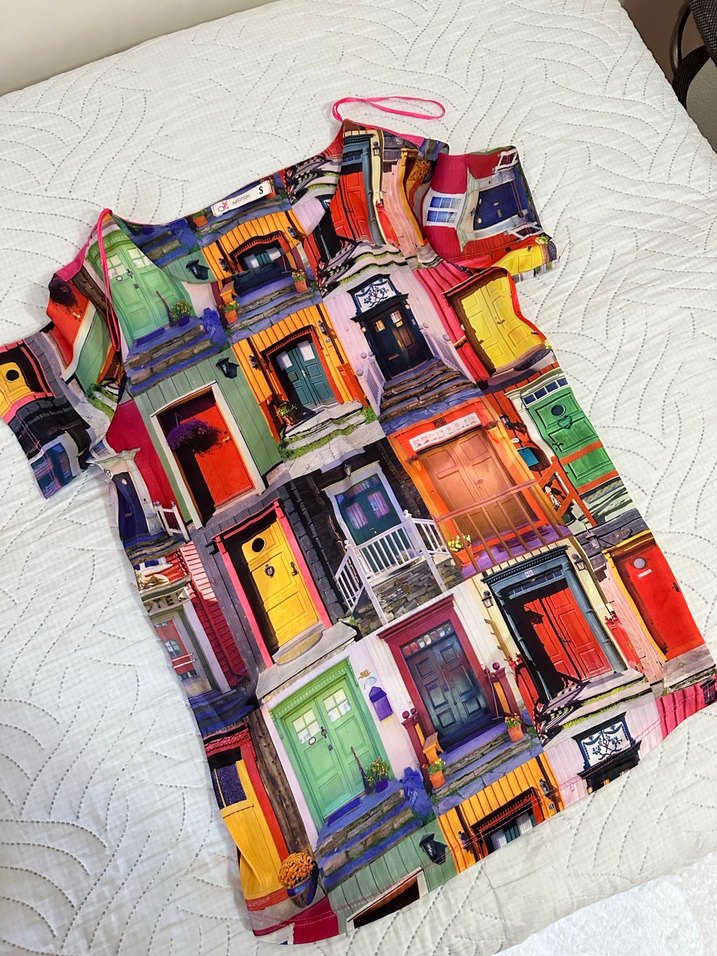 Yumuşak tekstil malzemeden yapılmış, çeşitli kapı desenleri ile renkli baskılı tişört.