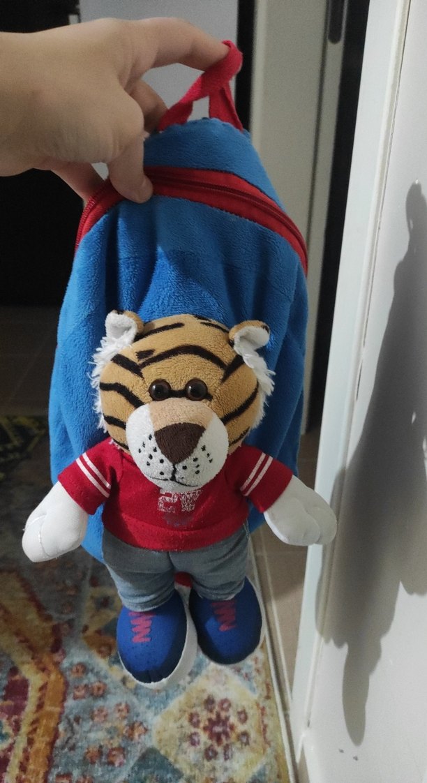 Yumuşak kumaştan yapılmış, kırmızı gömlekli ve mavi ayakkabılı peluş kaplan figürlü renkli sırt çantası.