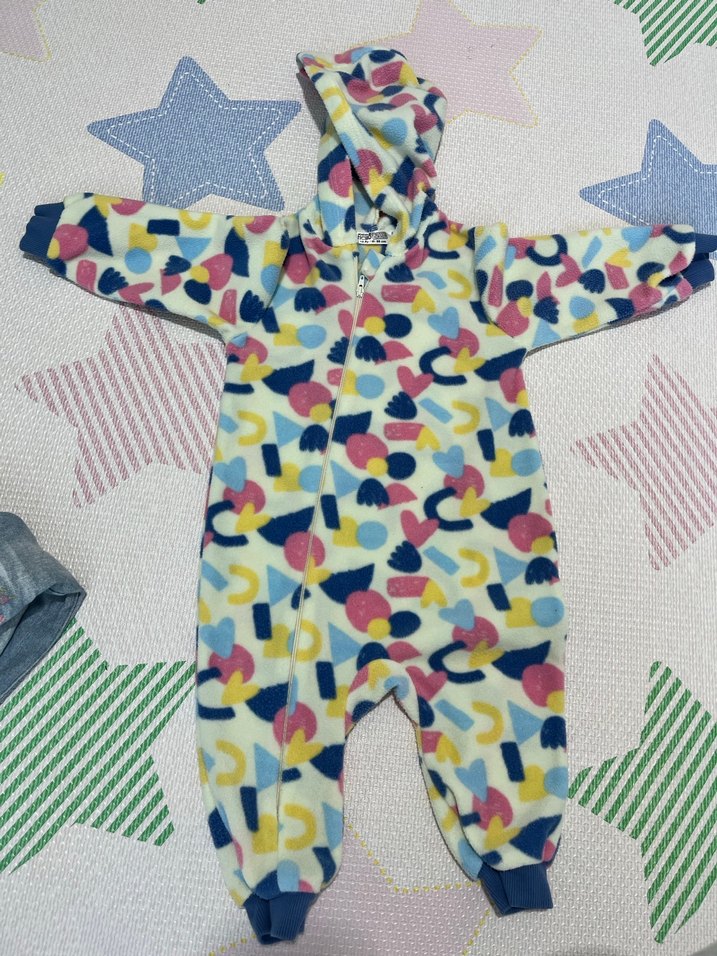 18 ay 1 kere giyildiRenkli ve kapüşonlu, örgü dokulu bebek kız tulumu. Canlı batik desenli ve ön fermuarlı.