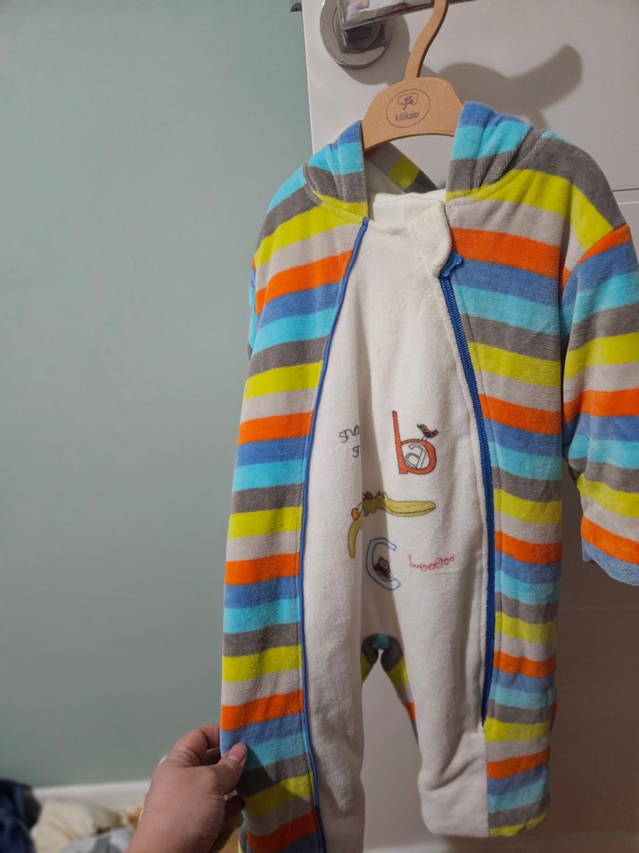 Renkli çizgili, kapüşonlu ve fermuarlı bebek tulumu, yumuşak ve sıcak kumaştan üretilmiştir.