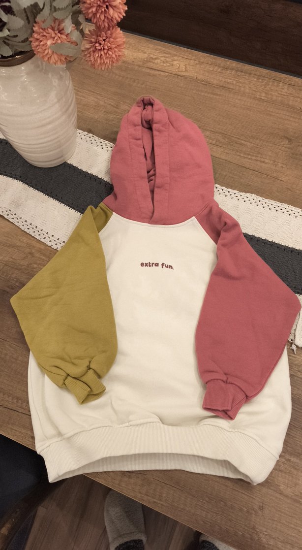 Çocuklar için pastel tonlarda çok renkli, kapüşonlu ve uzun kollu sweatshirt. Rahat kesim ve önünde "extra fun." baskısı bulunur. Yumuşak ve sıcak kumaştan üretilmiştir.