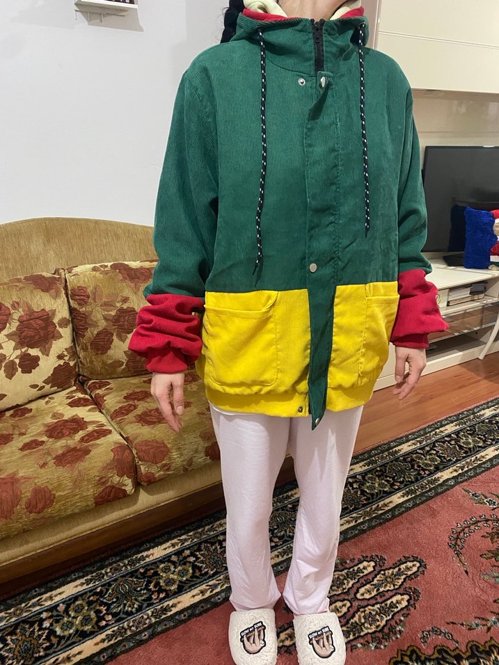 Renkli bloklardan oluşan, kapüşonlu ve düğmeli kadın ve erkek kullanabilir.Salaş kesim ve midi boyda, günlük rahat kullanıma uygun bir sokak stili ürünü.