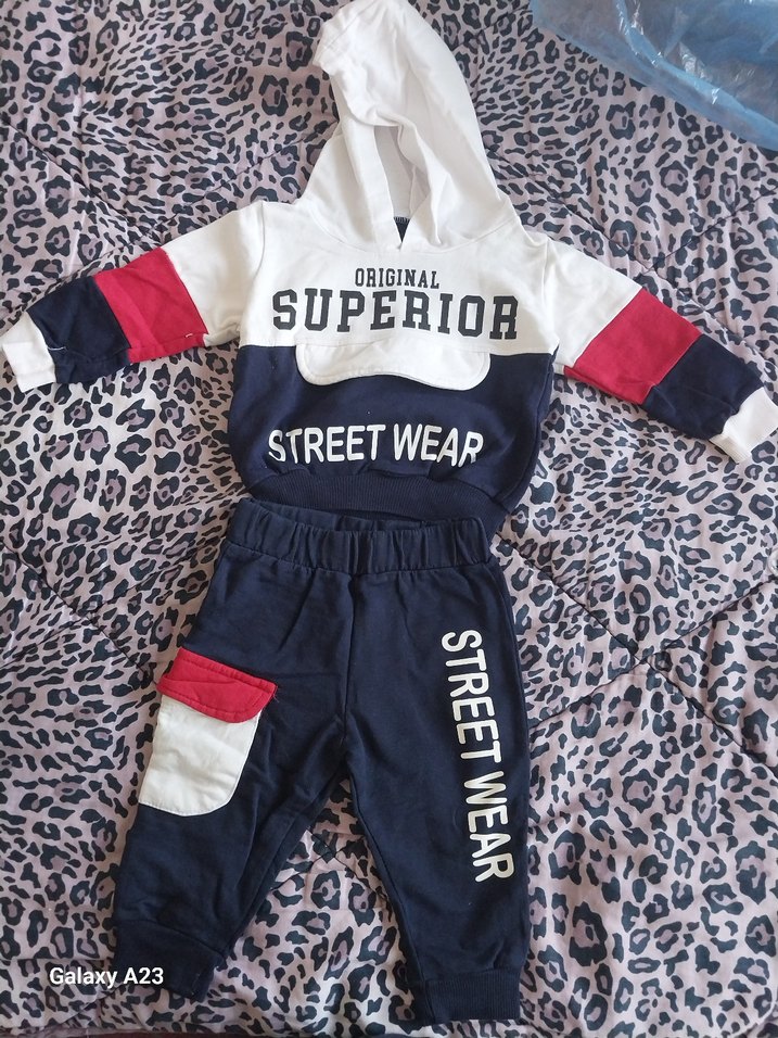 Renkli, kapüşonlu uzun kollu üst ve cepli alt pantolondan oluşan erkek bebek eşofman takımı. "Original Superior" ve "Street Wear" baskılı. Yumuşak sentetik kumaş. 9 ay yazıyor ama 9 aya olmaz 3 6 ay ideal . benim bebeğime olmadı biraz kilolu bunu göz ön0nde bulundurarak inceleyin lütfen.