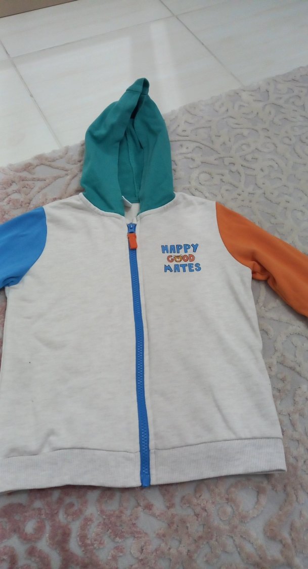 Pamuklu yumuşak kumaştan, uzun kollu ve kapüşonlu erkek çocuk sweatshirtü. Renkli kollar ve baskılı 'HAPPY GOOD MATES' yazısı ile dikkat çeker.