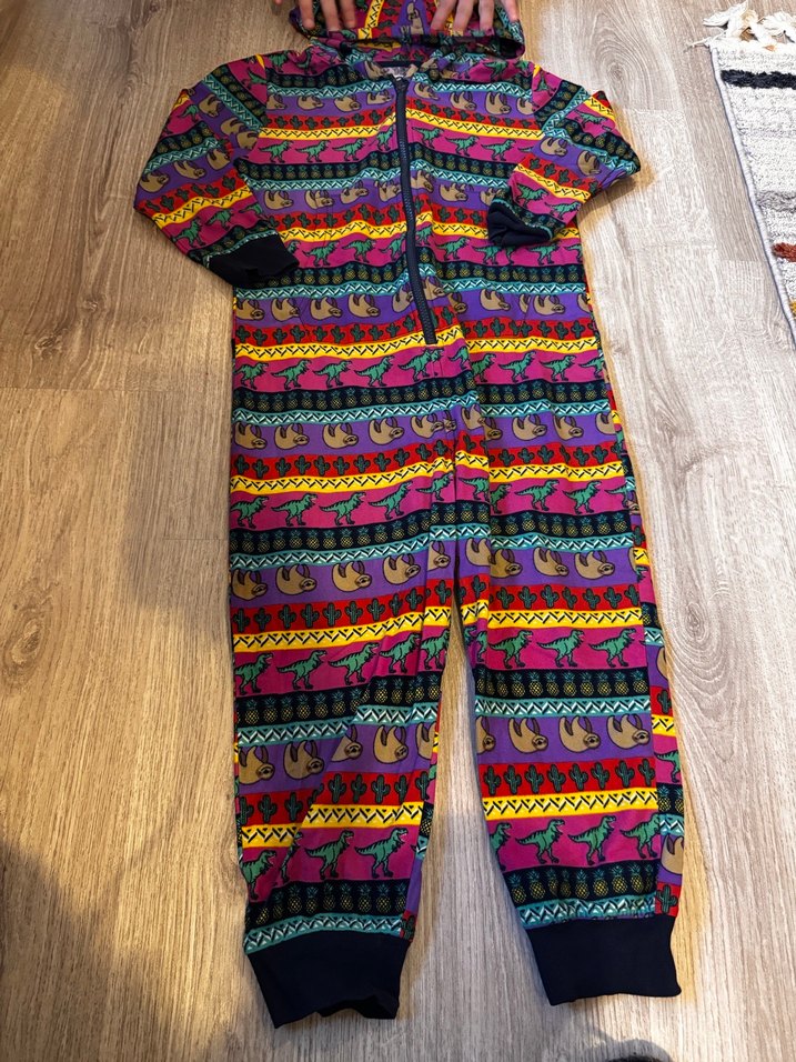 Renkli kapüşonlu, uzun kollu, bol kesim kadın tulumu. Örgü dokusu ve canlı batik desenleriyle rahat ve şık bir sokak giyimi ürünü.