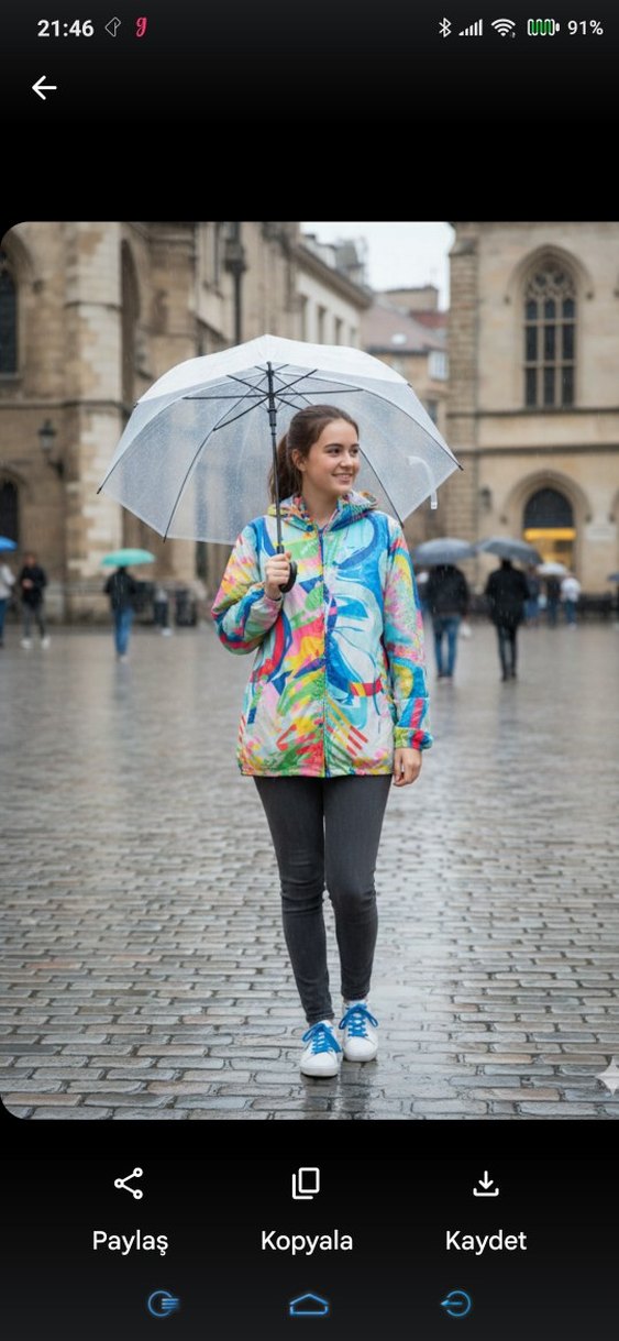 Renkli batik desenli, kapüşonlu ve fermuarlı kadın yağmurluk. Uzun kollu, bol kesim ve kısa boyuyla sokak ve spor tarzına uygun. Boy 68 iki koltuk arası 118 cm