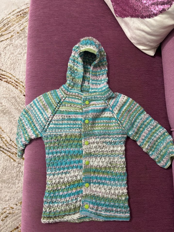 Renkli, örgü kız erkek hırkası kapüşonlu ve düğmeli, uzun kollu, vücuda oturan kesime sahiptir.