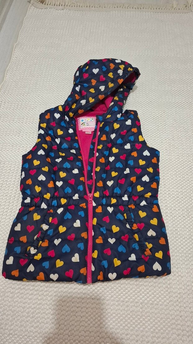Renkli kalp desenli, kapüşonlu ve fermuarlı kız yeleği. Yumuşak ve sıcak kumaştan, rahat sokak tarzı için uygun.