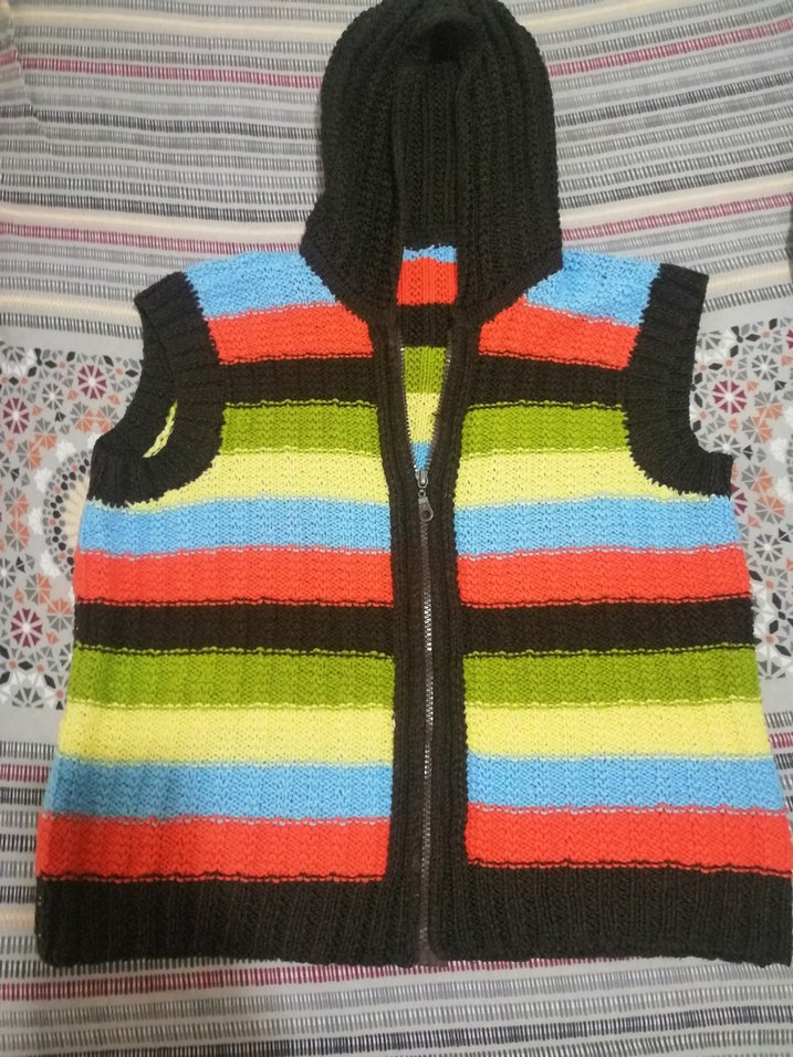 Renkli yatay çizgilerle kolsuz, kapüşonlu ve boğazlı örgü kadın süveter. Fit kesim ve rahat kullanım için uygun. Boy uzunluğu 54cm iki omuz arası 43 cm iki koltuk altı arası 52 cm’dir.
