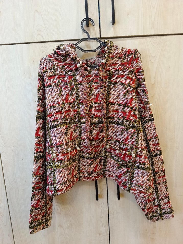 Renkli, kapüşonlu, uzun kollu ve bol kesim kısa örgü kadın kazak. Bağcıklı ve batik desenlidir, rahat ve sokak stiline uygundur.