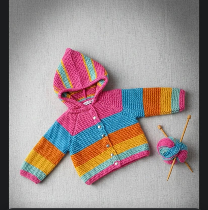 Renkli, kapüşonlu, uzun kollu ve çıt çıtlı kız örgü hırkası, bol kesim ve canlı renklerle tasarlanmıştır. 9/12 ay uyumludur.Tamamen el işçiliği ile yüksek kalite bebe yününden üretilmiştir.