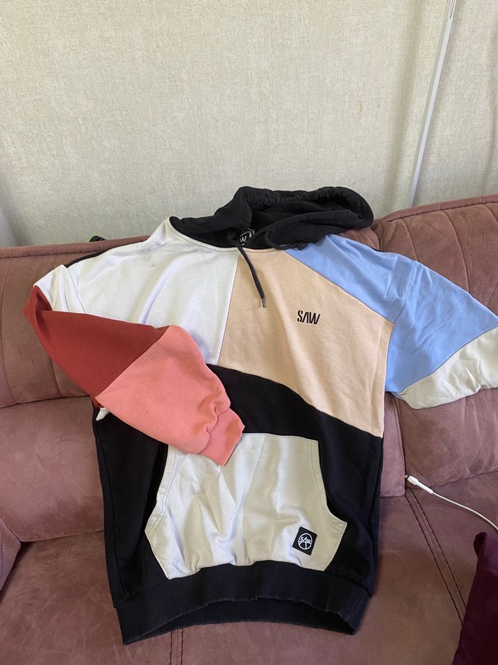 kapüşonlu, fermuarlı ve bol kesim sweatshirt. Yumuşak kumaştan, uzun kollu, pastel çok renkli baskılı ve 'SAW' yazılı. Günlük rahat stil için uygundur. Kolukta küçük bir delik yakasında da leke var leke yıkayınca çıkabilir emin değilim