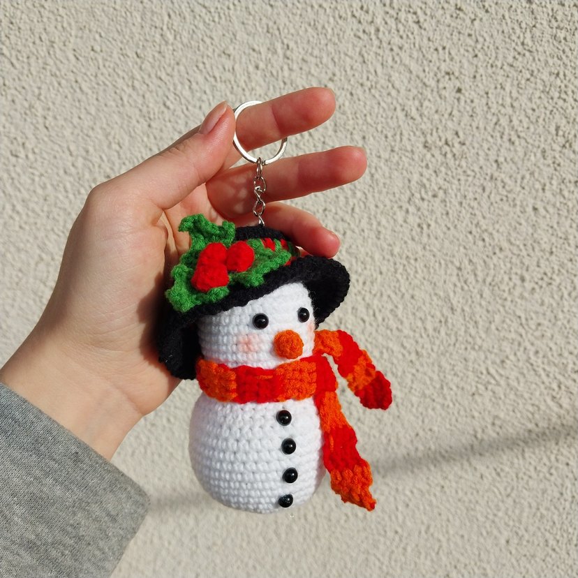 Bu renkli peluş anahtarlık, siyah şapkalı, yeşil yaprak ve kırmızı meyvelerle süslü beyaz kar adam figürüne sahiptir. Kırmızı-turuncu atkı ve siyah düğmeler bulunur. ❄️