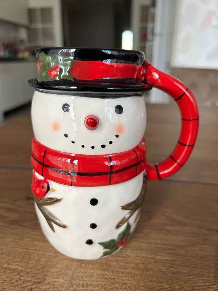 Seramikten yapılmış, siyah şapkalı ve kırmızı atkılı renkli kar adam figürlü kupa ☕️.