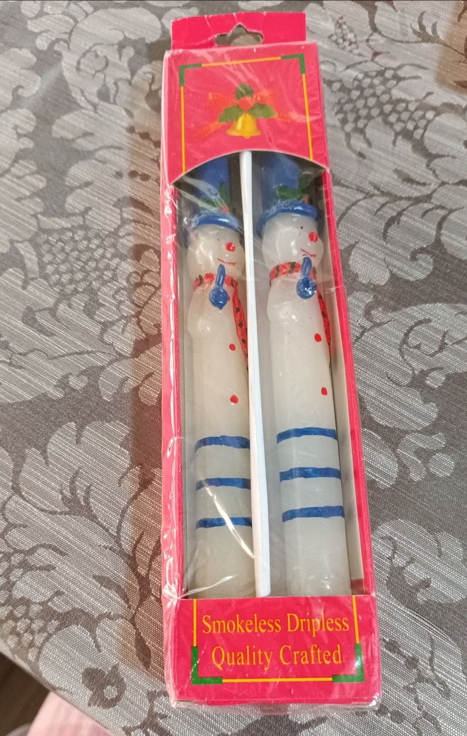 Kaliteli işçilikle üretilmiş, duman yapmayan ve damlatmayan renkli kar adamı figürlü iki mum seti. ❄️