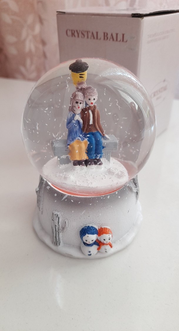 Renkli figürlerin olduğu, kar taneleriyle süslenmiş beyaz tabanlı kar küresi biblo. İçinde bankta oturan çift ve sokak lambası bulunur. ❄️