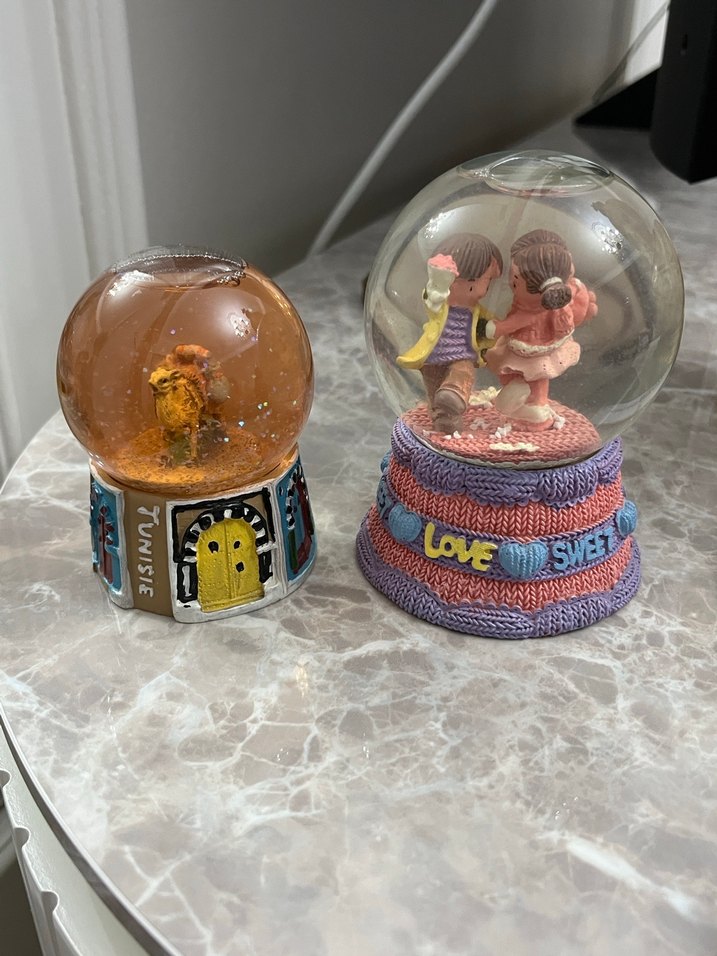 İki renkli kar küresi; biri çiçek tutan çocuk, diğeri 'Love Sweet' yazılı örgü taban üzerinde dans eden çift figürü içerir. ❄️