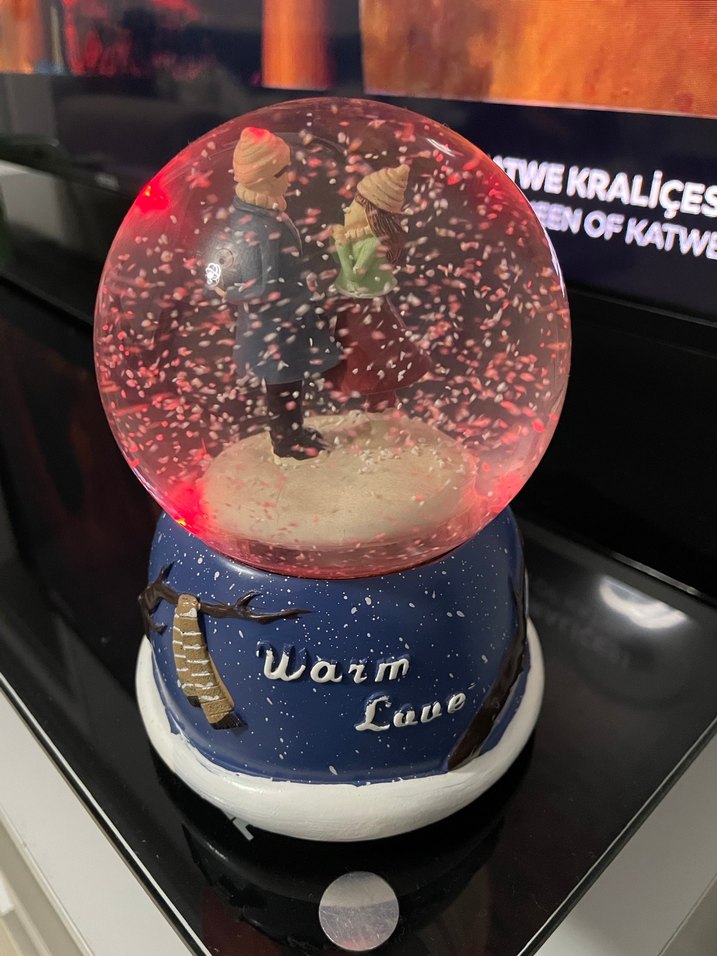 Renkli kar küresi içinde çift figürü ve mavi tabanda "Warm Love" yazısı bulunan dekoratif biblo. Kar efekti sunar. ❄️ Müzikte çalmaktadır.