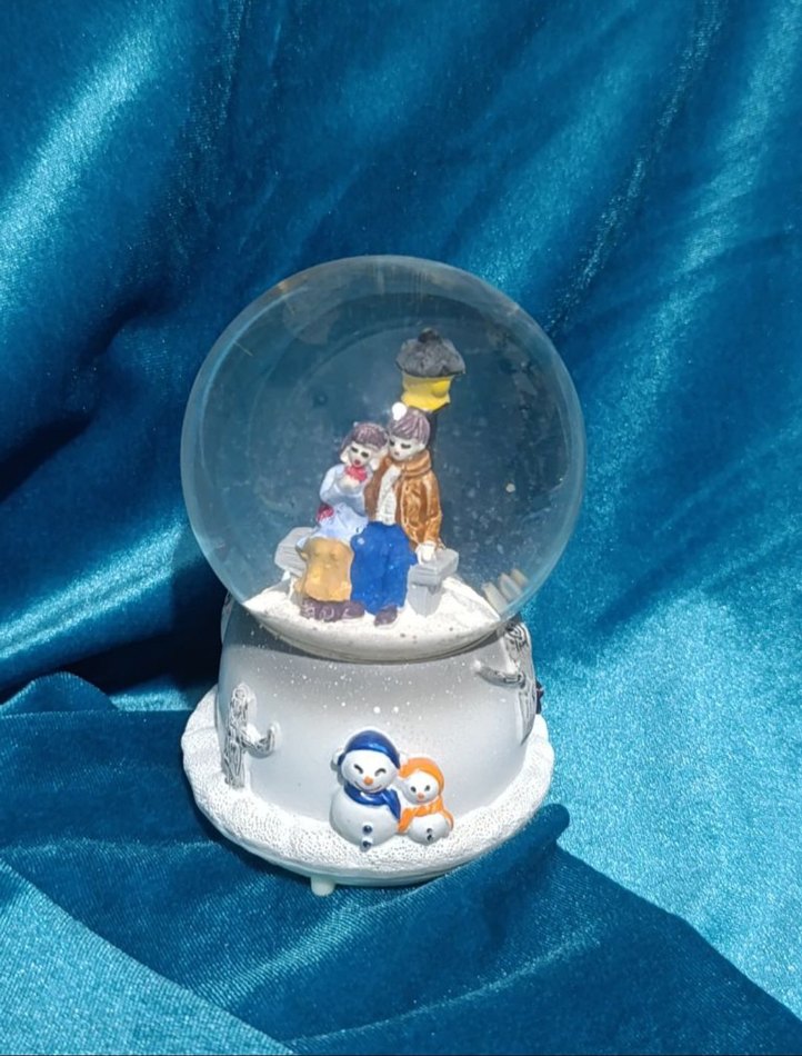Renkli kar küresi biblosunda aile sahnesi ve kar temalı taban var. Müzikli ve mavi fonlu dekoratif ürün. ❄️