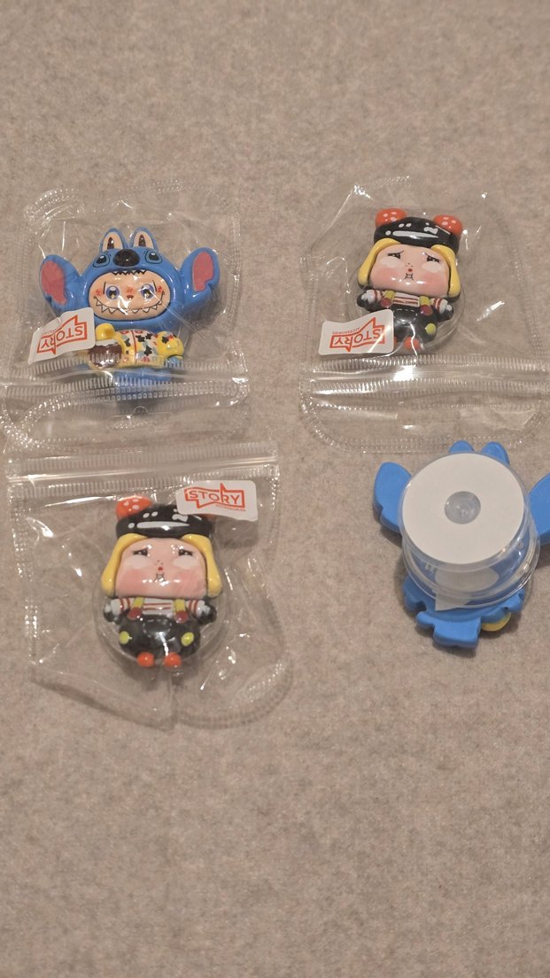 Mavi ve renkli detaylara sahip, paketli karakter figürleri seti.