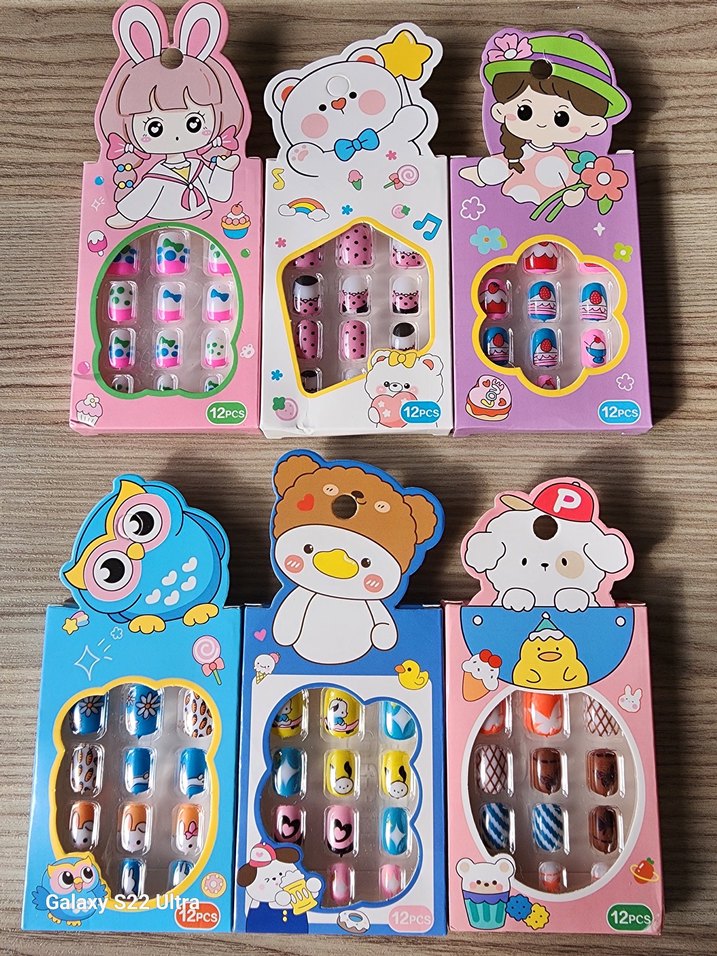 Farklı sevimli karakterlerin yer aldığı, her pakette 12 adet renkli çocuk takma tırnak tekli paket fiyatidir.