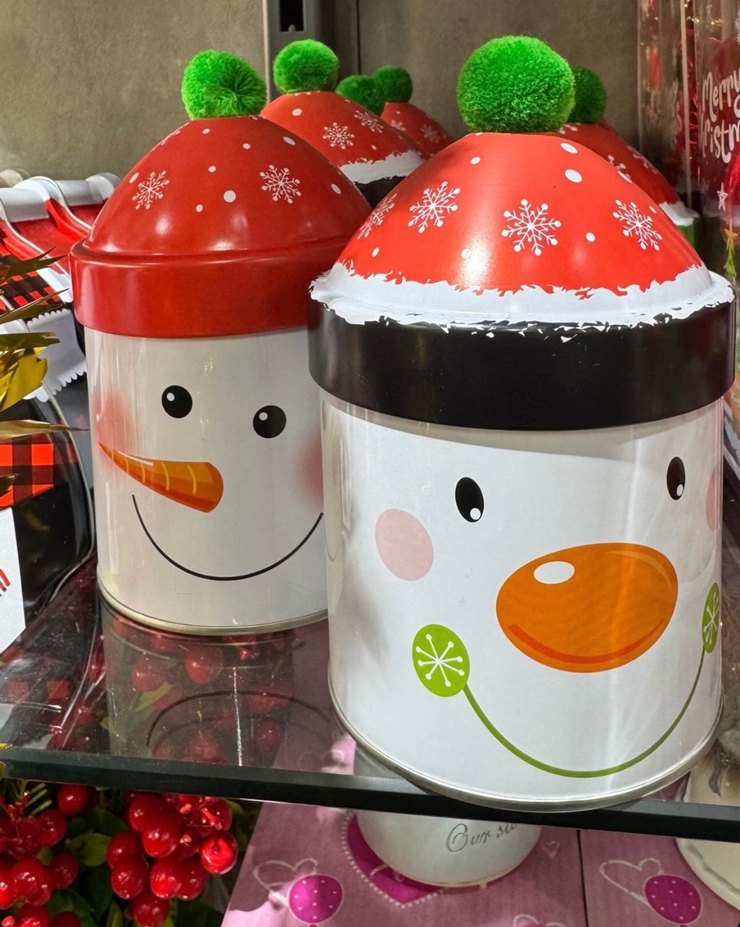 Oyunlu kar tanesi desenli kırmızı kapaklı, yeşil ponponlu renkli metal kutuları