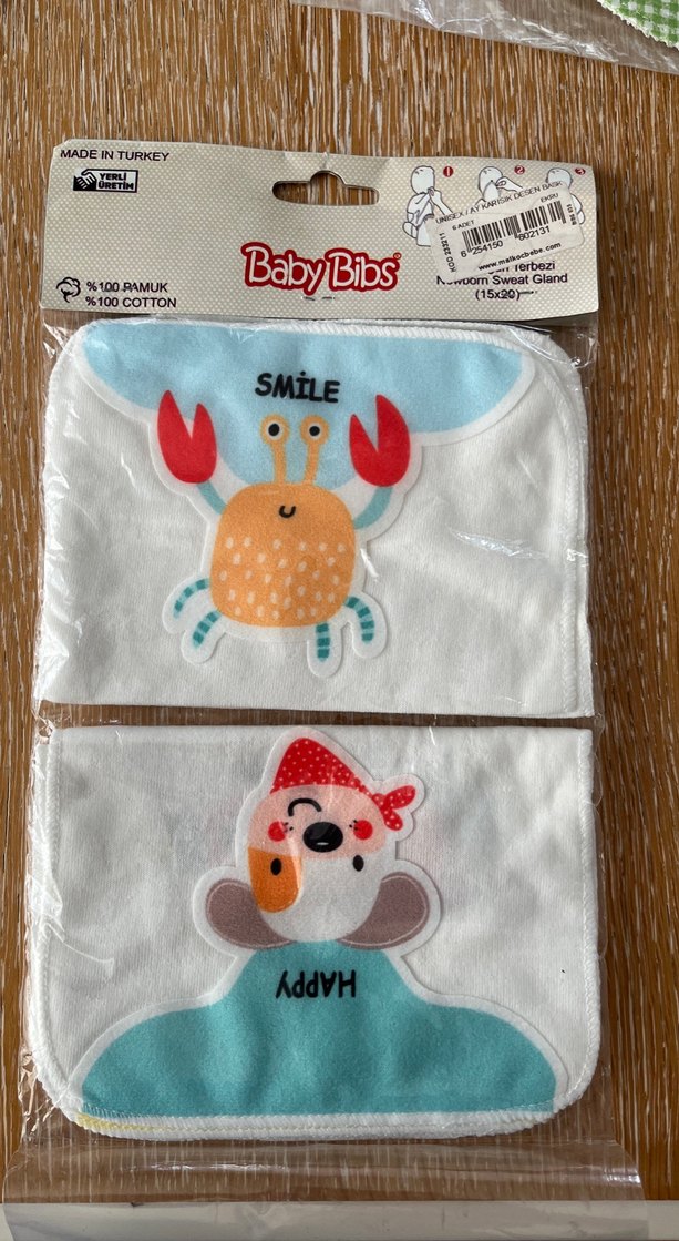 Mavi ve beyaz renklerde, yumuşak pamuklu kumaştan yapılmış nakışlı hayvan desenli renkli bebek önlükleri. Üzerinde 'SMILE' ve 'HAPPY' yazıları bulunur. Türkiye'de üretilmiştir.