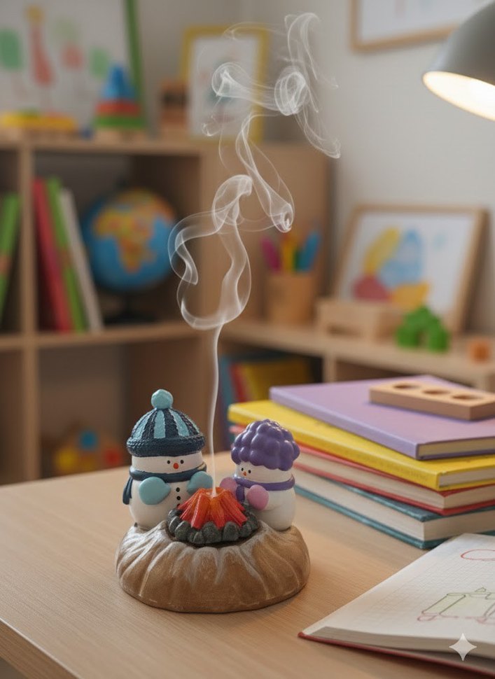 İki karakterin kamp ateşi etrafında oturduğu, duman çıkaran renkli tütsülük biblo. tamamen el boyamasıdır.