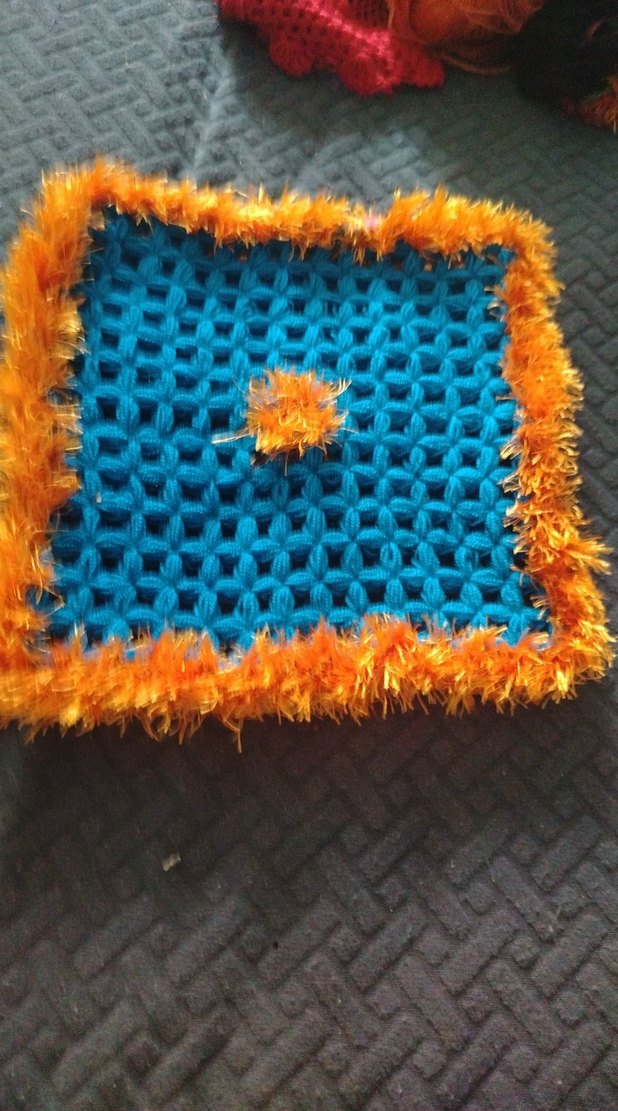 Dokuya sahip renkli kare banyo süngeri, kenarları turuncu tüylü, nazik temizleme sağlar.