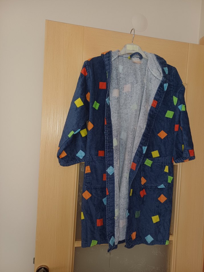 Kapüşonlu, yumuşak astarlı, ön cepli, renkli kare desenli rahat bornoz.