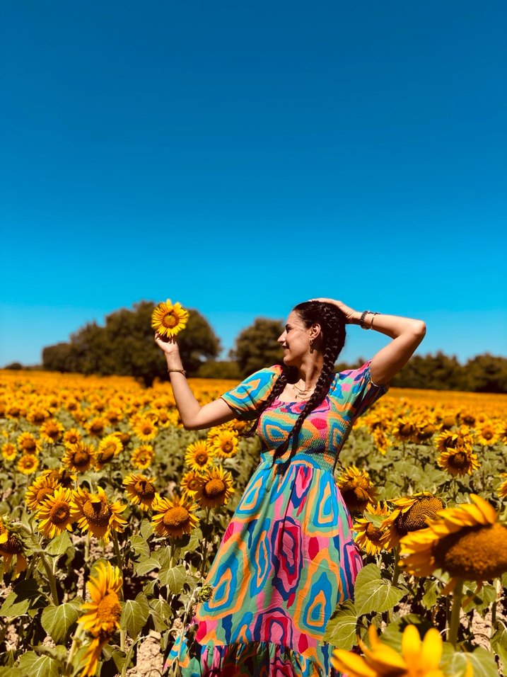 Renkli bağlamalı V yaka, kısa balon kollu, bol kesim uzun elbise. Sentetik kumaştan, açık hava etkinlikleri için uygun.