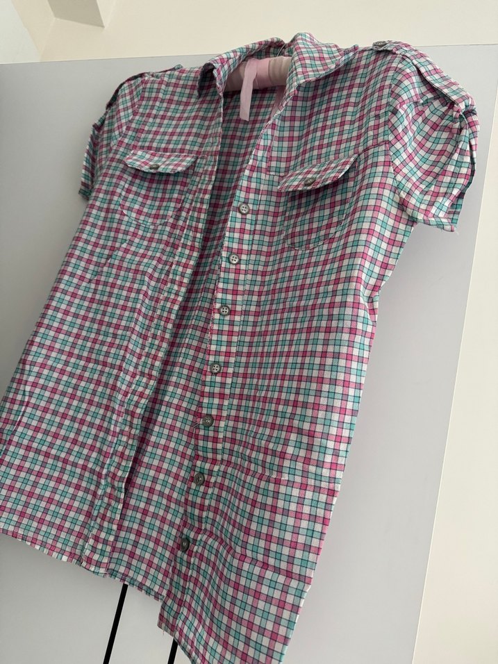 Renkli kareli kadın gömlek, kısa kollu, yakalı ve düğmeli ön tasarıma sahiptir. Salaş kesim ve normal boydadır, günlük rahat tarz için uygundur. S/M beden uyumlu