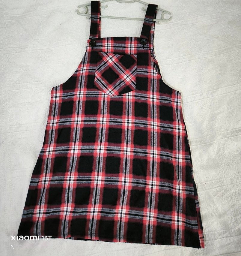 Renkli kareli desenli kırmızı salopet ayarlanabilir askılar ve ön cep ile kullanışlıdır.