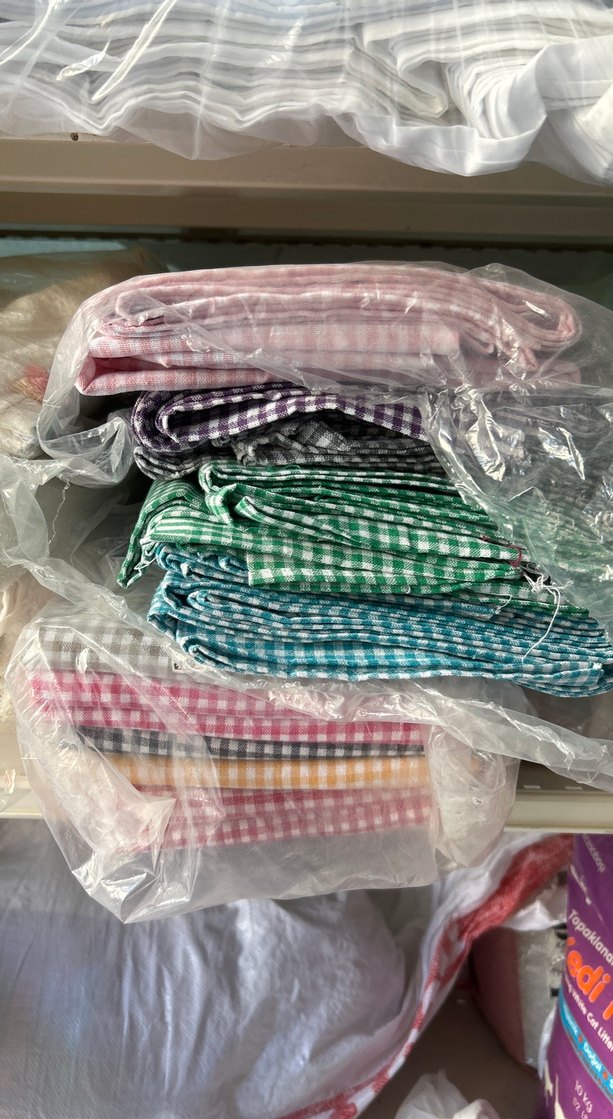 Pembe, mor, yeşil, mavi ve çizgili desenlerde hafif kumaştan yapılmış çok renkli kareli masa örtüleri seti. ️denizli dokuması