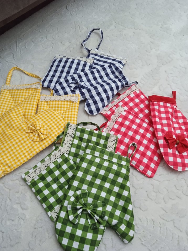 Dantel detaylı ve fiyonk süslemeli, renkli kareli mutfak önlükleri ve uyumlu fırın eldivenleri seti.