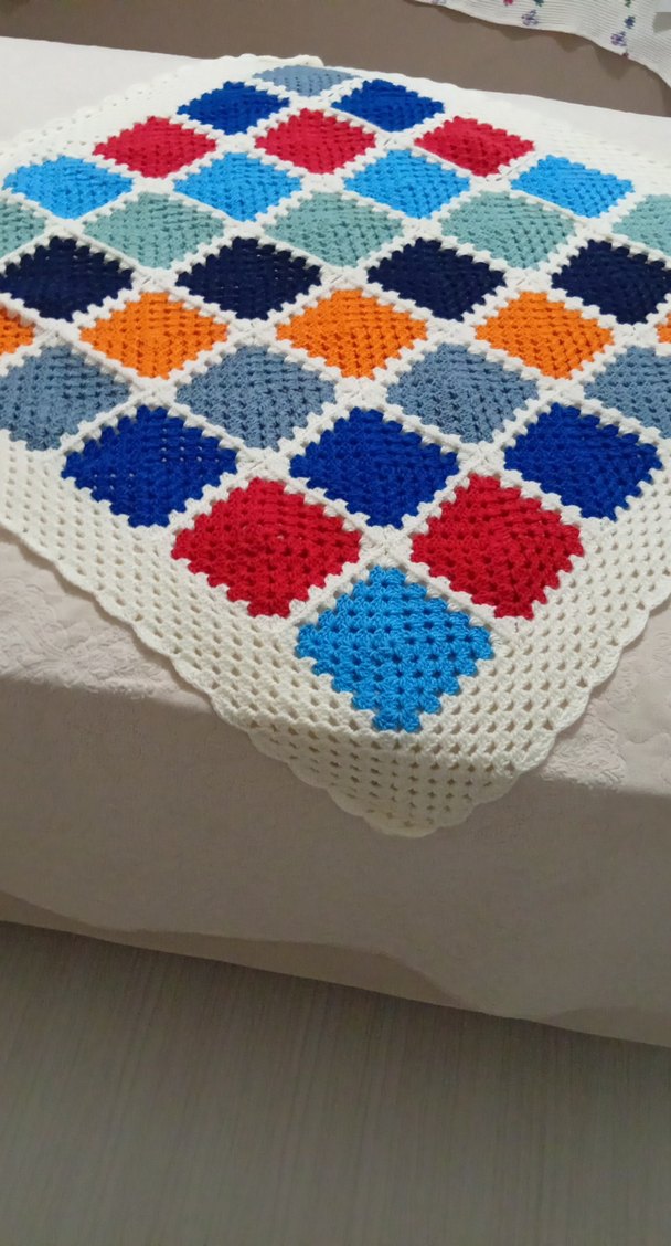 Renkli kareli desenli, yumuşak ve sıcak tutan örgü battaniye. Ev dekorasyonuna renk katar.
