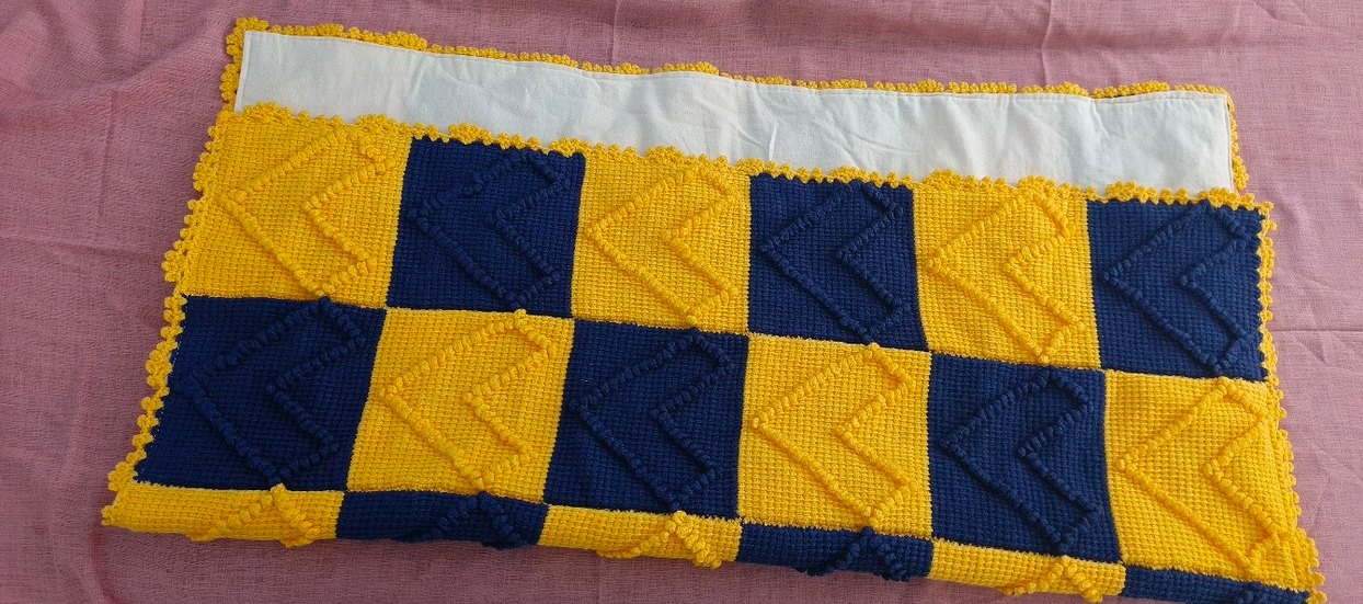 Sarı ve lacivert kareli desenli, renkli örgü çocuk battaniyesi. Yumuşak ve rahat dokusu ile çocuklar için uygundur.