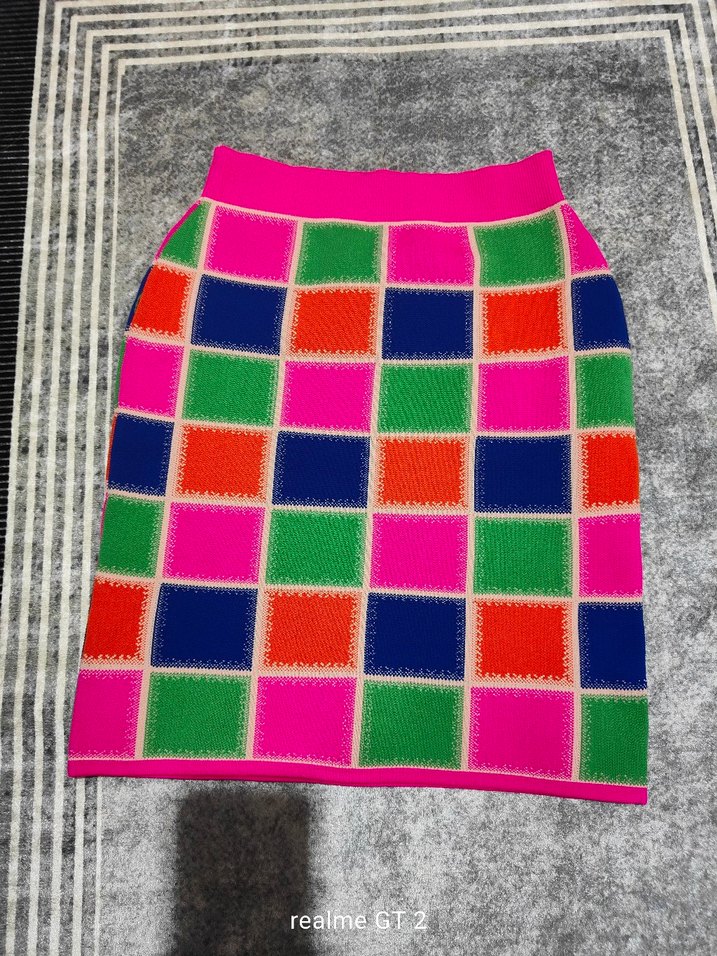 Renkli kareli desen ve örgü dokusuna sahip, dar kesim mini etek, trend ve avangard stil için uygundur.
