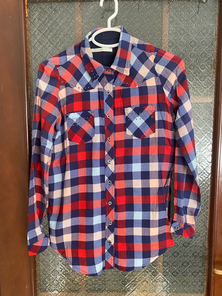 Kadınlar için uzun kollu, yakalı ve bol kesim gömlek. Renkli kareli desenli, düğmeli ve sentetik kumaştan, sokak stili için uygun. Günlük kullanıma uygun.