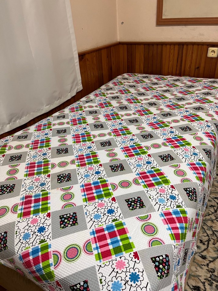 Renkli kareli desen ve çiçek motifleriyle canlı bir görünüm sunan yatak örtüsü. ️