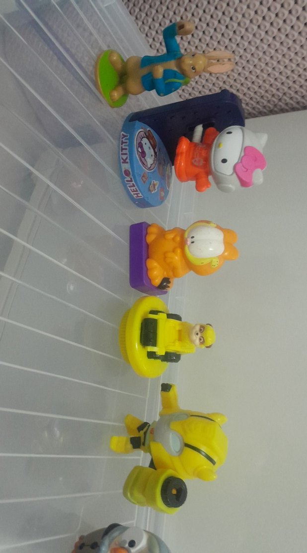 Hello Kitty ve Garfield gibi karakterlerin bulunduğu renkli plastik çocuk oyuncakları.