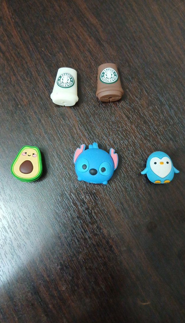 Avokado, mavi çizgi film karakteri, penguen ve iki kahve fincanı şeklinde renkli küçük oyuncak figürler seti.