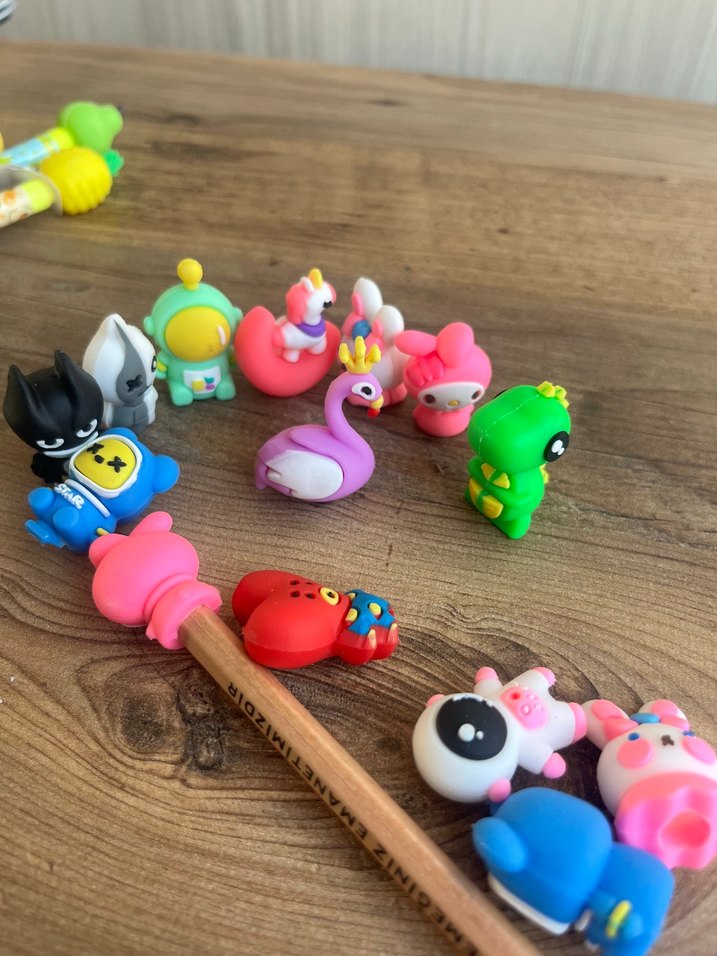 Çeşitli hayvan ve karakter figürlerinden oluşan renkli karışık oyuncaklar, flamingo, dinozor ve unicorn gibi figürler içerir.